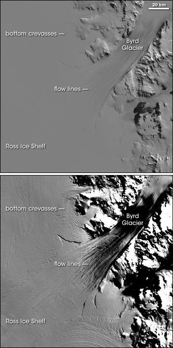 Detailed as it is, MOA is not intended to work in isolation; scientists designed it to integrate well with other images. For example, NASA and the Byrd Polar Research Center previously published an image of Antarctica based on radar data from the Radarsat Antarctic Mapping Project Antarctic Mapping Mission 1 (RAMP AMM-1). “In fact, we used RAMP data as a reference when we built MOA,” says Scambos. “RAMP is great for looking at subsurface features. MOA focuses on the surface. So depending on what you’re looking for, you can use either mosaic alone, or combine them [MOA and RAMP maps] for a more complete picture.”