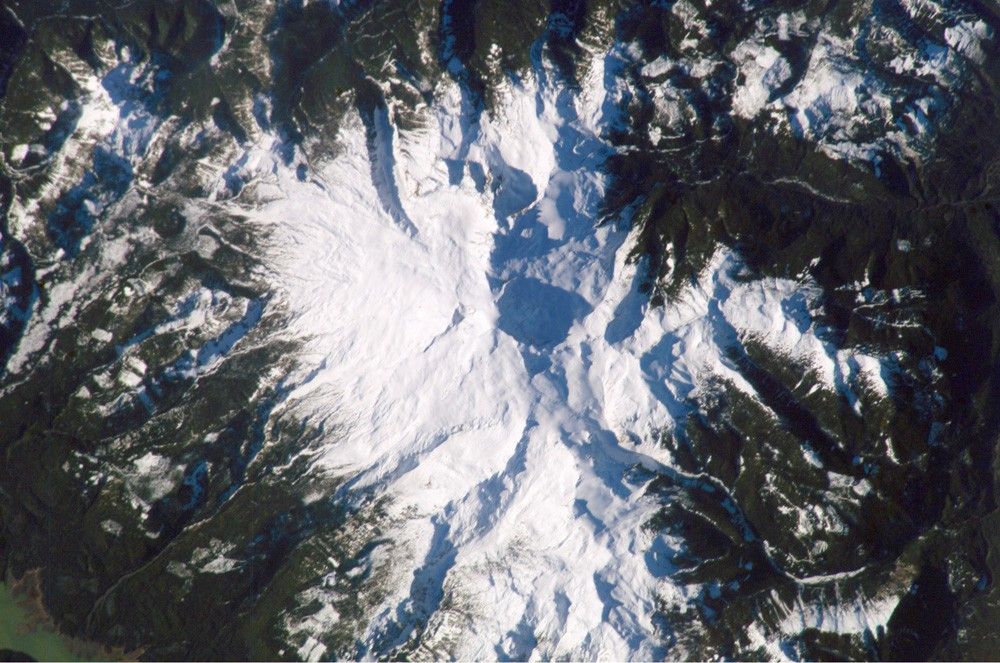 These two photographs were taken from the International Space Station. The high-resolution image provides details of the rough terrain near the summit and on the upper flanks. The lower view provides a regional picture of Mount Baker, showing its proximity to Bellingham.