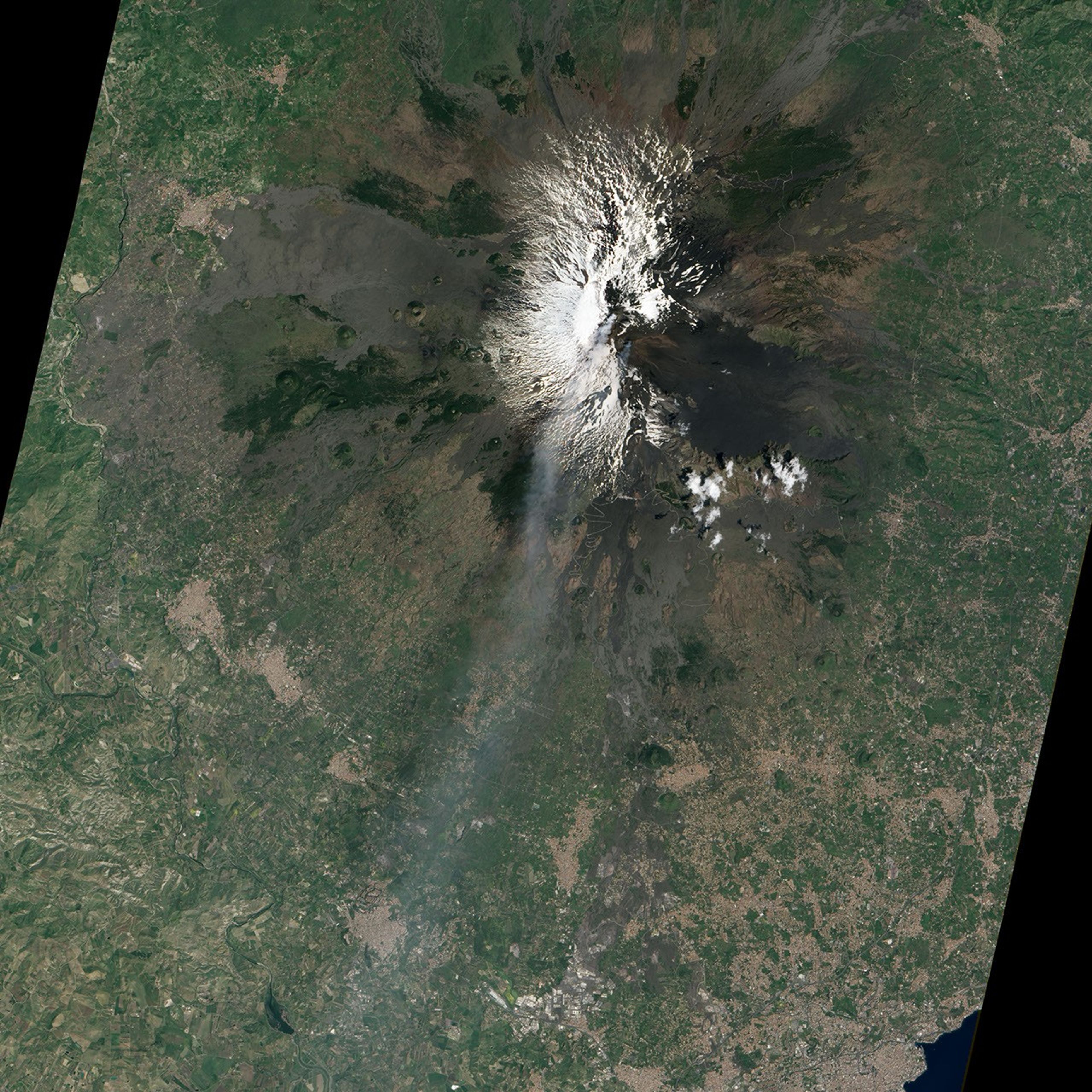 Located roughly 25 kilometers (15 miles) north-northwest of Sicily’s second-largest city, Mount Etna is a stratovolcano composed of layers of rocks, lava, and volcanic ash left by earlier eruptions. The summit reaches an altitude of 3,330 meters (10,925 feet) above sea level. People have lived around Etna for millennia, so scientists have one of the longest documented records of activity of any volcano in the world—dating back to 1500 B.C.