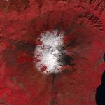 This false-color image combines near infrared, red, and green light. Snow is white, geologically fresh (up to 100 years old) lava is black and dark brown, while vegetation is deep red. The volcanic plume is light gray. The image was collected by the Advanced Spaceborne Thermal Emission and Reflection Radiometer (ASTER) on NASA’s Terra satellite.