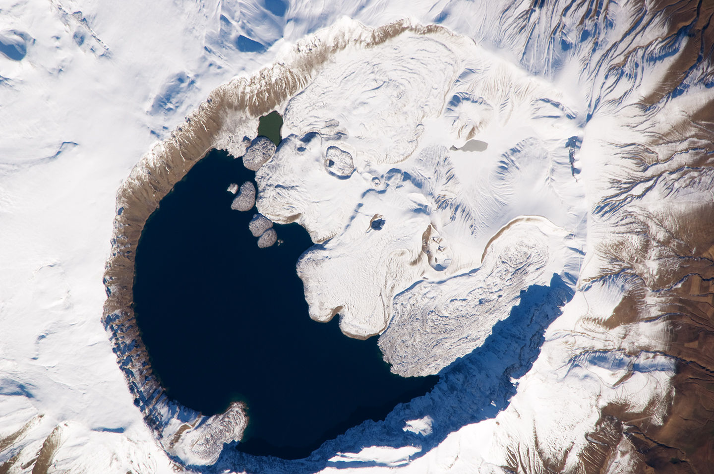 This detailed astronaut photograph centers on the summit caldera of Mount Nemrut (Nemrut Dagi in Turkish), a stratovolcano in the eastern Anatolia region of Turkey, along the shoreline of Lake Van. Winter snow blankets the 2,948-meter (9,672-foot) summit of the mountain, highlighting the brown caldera rim. (A caldera is a large crater, usually circular or elliptical, formed when the underlying magma chamber empties rapidly.)
