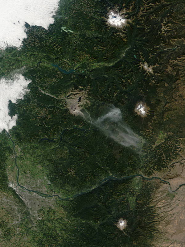 Mt. St. Helens is located to the left of the center of this image, and the ash and steam plume are visible drifting away from the volcano to the southeast, toward the glacier-covered peak of Mt. Adams. Other large mountains in the scene are Mt. Rainer (top) and Mt. Hood (bottom). The Columbia River cuts east-west through the lower part of the image, and the city of Portland appears as a gray patch along its banks at lower left.