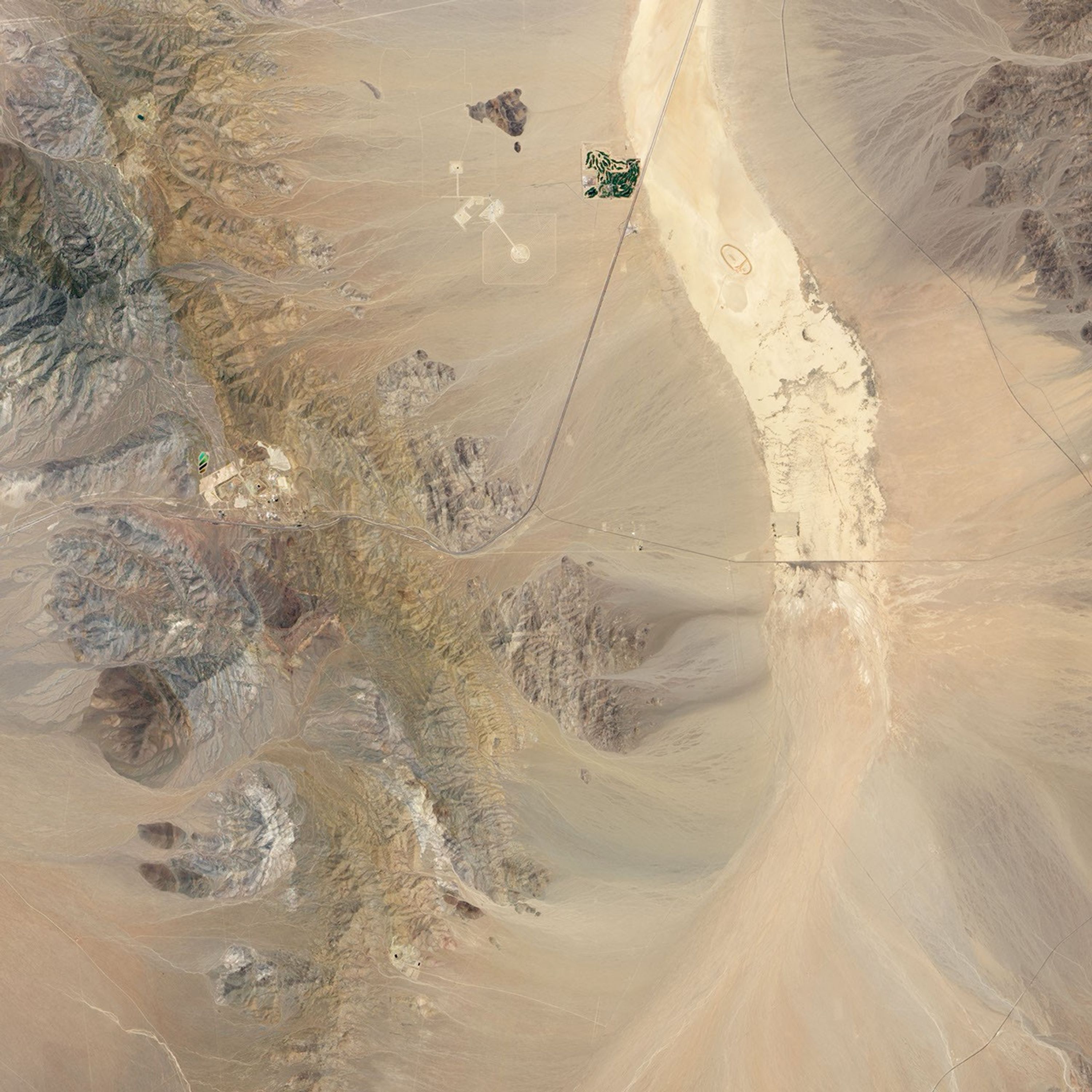 The Advanced Land Imager (ALI) on NASA’s Earth Observing-1 (EO-1) satellite captured this image on May 28, 2011. The mine is a network of buildings, terraced land, and roads situated in a mountain range within the Mojave Desert. The bright green areas in the northwest are settling ponds—reservoirs where mining wastewater is held until the suspended particles slowly precipitate out to the bottom.