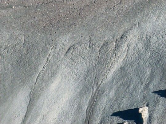 Eventually, the dam gives way and a massive flow of mud and debris churns down the mountain toward farmland and towns below. Scientists estimate that Ruapehu has experienced 60 lahars in the last 150 years. A devastating lahar in 1953 killed more than 150 people, who died when a passenger train plunged into a ravine when a railroad bridge was taken out by the lahar. The flank of the volcano below the lake is deeply carved by the path of previous lahars; the gouge can be seen just left of image center.