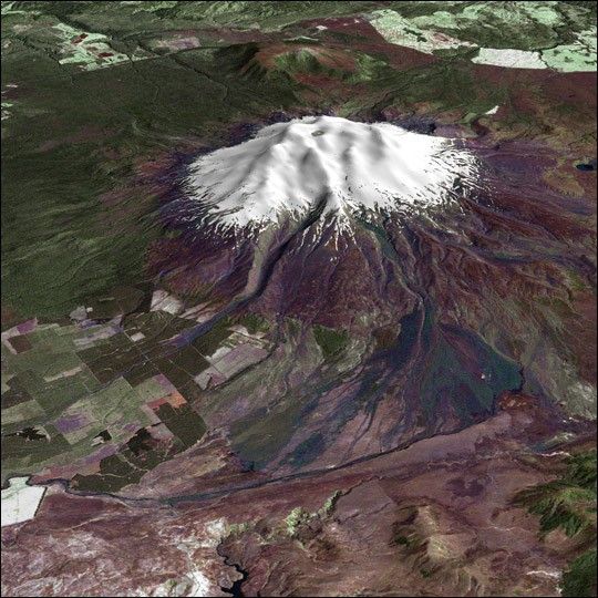 All around the world, people live in places where the threat of natural disaster is high. On the North Island of New Zealand, the Mount Ruapehu volcano is just such a threat. A towering, active stratovolcano (the classic cone-shaped volcano), snow-capped Ruapehu Volcano is pictured in this enhanced-color image. The image is made from topography data collected by the Shuttle Radar Topography Mission aboard the Space Shuttle Endeavour, launched on February 11, 2000, and imagery collected by the Landsat satellite on October 23, 2002.