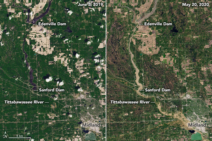 The natural-color images on this page show flooding across Midland County as observed by the Operational Land Imager (OLI) on Landsat 8. The pair above shows the Tittabawassee River on May 20, 2020 (right), compared to June 3, 2019 (left). The images below provide a wider view, including the location of the Edenville and Sanford dams.