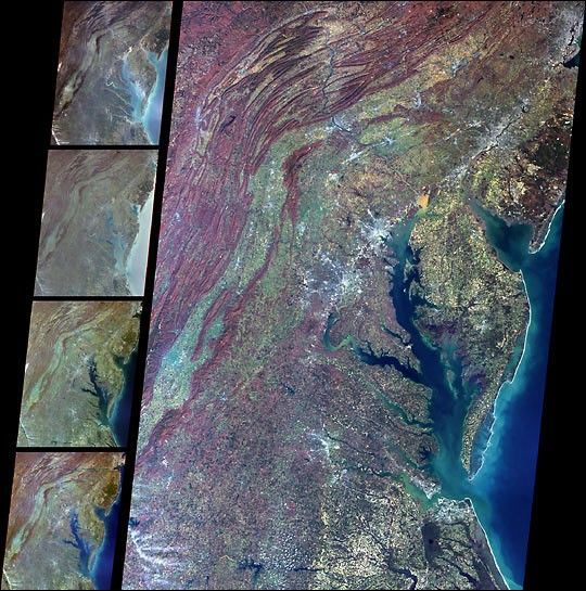 Multi-angle Imaging SpectroRadiometer (MISR) images of Delaware Bay,Chesapeake Bay, and the Appalachian Mountains acquired on March 24, 2000during Terra orbit 1417. The large image on the right was taken by the MISR camera viewing straight down (nadir). The series of smaller images, from top to bottom, respectively, were taken by cameras viewing 70.5 degrees forward, 45.6 degrees forward, 45.6 degrees aftward, and 70.5 degrees aftward of nadir. These images cover the environs of Newark, Philadelphia, Baltimore, Washington, and Richmond. Differences in brightness, color, and contrast as a function of viewangle are visible over both land and water. Scientists are using MISR datato monitor changes in clouds, Earth’s surface, and pollution particles inthe air, and to assess their impact on climate.