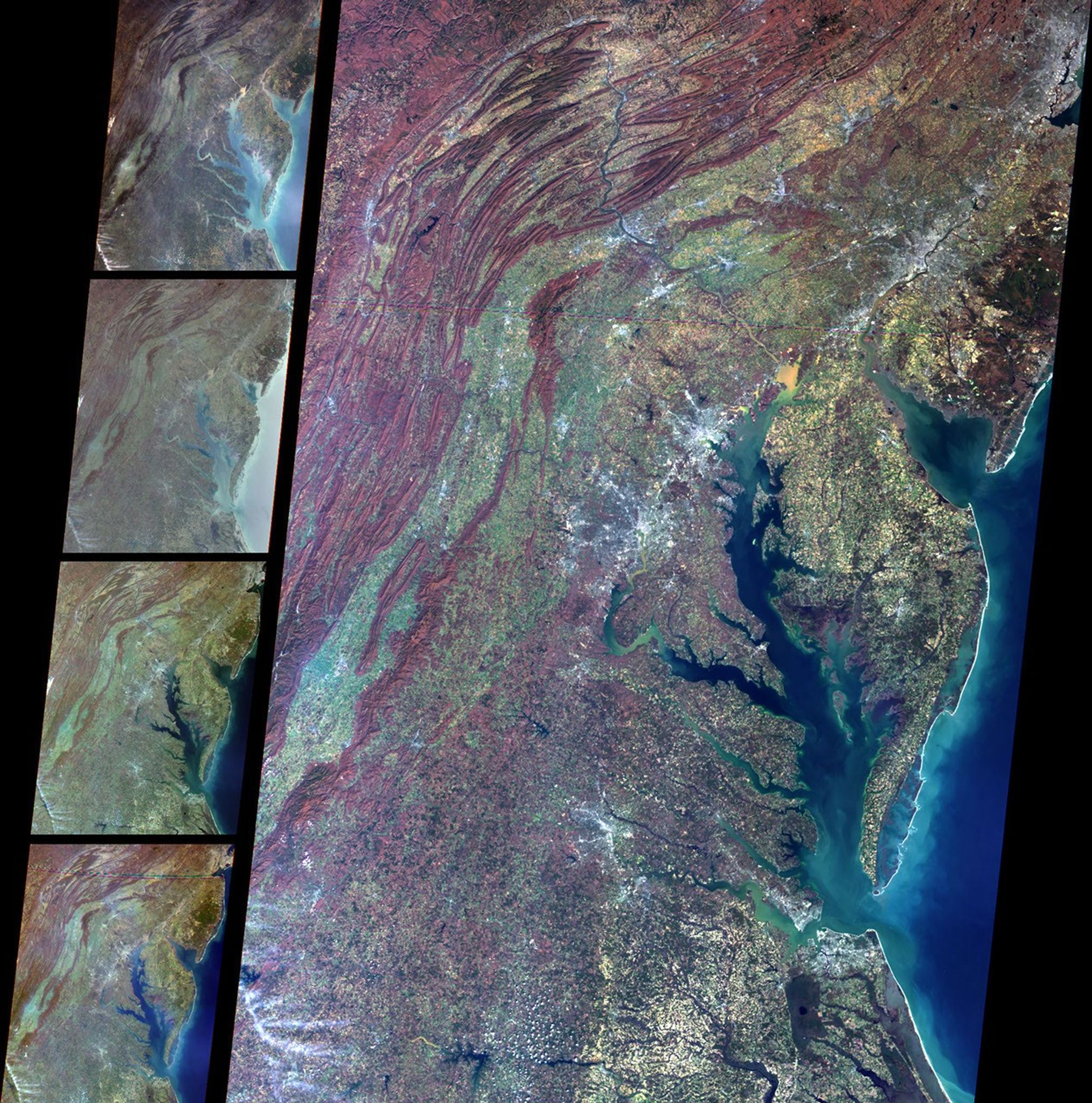 Multi-angle Imaging SpectroRadiometer (MISR) images of Delaware Bay,Chesapeake Bay, and the Appalachian Mountains acquired on March 24, 2000during Terra orbit 1417. The large image on the right was taken by the MISR camera viewing straight down (nadir). The series of smaller images, from top to bottom, respectively, were taken by cameras viewing 70.5 degrees forward, 45.6 degrees forward, 45.6 degrees aftward, and 70.5 degrees aftward of nadir. These images cover the environs of Newark, Philadelphia, Baltimore, Washington, and Richmond. Differences in brightness, color, and contrast as a function of viewangle are visible over both land and water. Scientists are using MISR datato monitor changes in clouds, Earth’s surface, and pollution particles inthe air, and to assess their impact on climate.