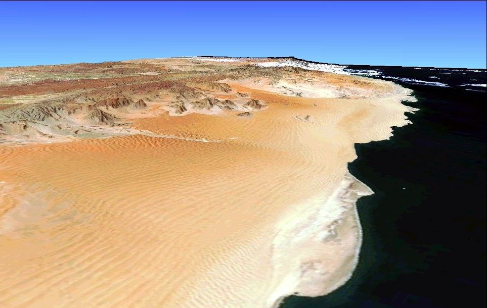 The dunes, pushed up by strong onshore winds, are the highest sand dunes in the world—as high as 300 to 350 meters (1000 to 1167 feet) in places. Rows of linear sand dunes can be seen as alternating ripples of darker and lighter orange in the center of the image. The dune shapes become more chaotic surrounding the mud plain where a river runs down out of the plateau (left of center), but doesn’t make it to the ocean.