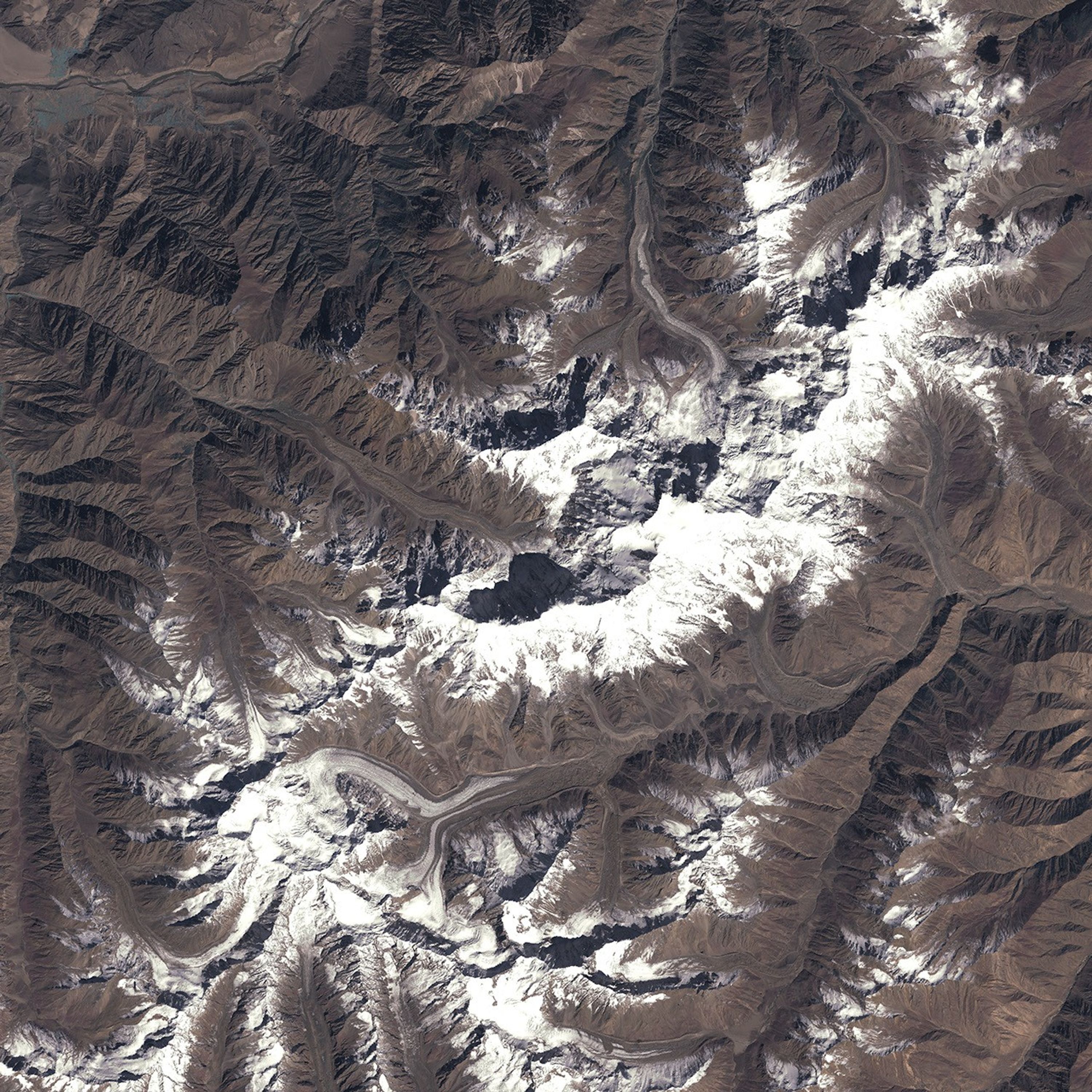In this satellite image, Nanga Parbat’s snow-covered ridgeline runs from lower left to upper right, and it casts black shadows onto the terrain to the northeast. Several of the valleys coming off the mountain are filled with grayish-white glaciers. Although these glaciers flow down the sides of Nanga Parbat to the northwest, north, and south, all waters from the mountain ultimately flow north into the Indus River (visible in the large image at upper left).Water from glaciers running south joins an existing stream at the base of the mountain, which turns east (lower right) and connects with other streams that flow north and feed into the Indus River.