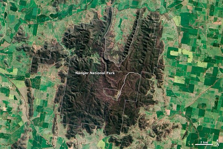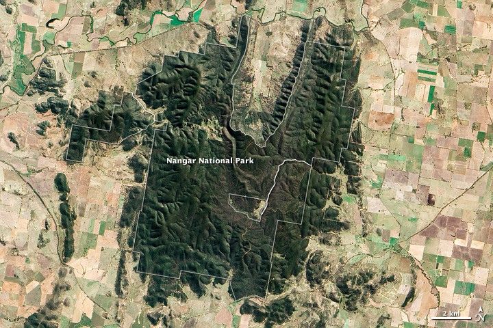 Located in New South Wales, Australia’s Nangar National Park rises from the surrounding plain. Although the western portion of the park features gentle slopes and wide valleys, the park’s northern reaches are filled with peaks, cliffs, and gorges in a zone of deeply folded and faulted ancient rocks. A winding line of cliffs marks the park’s northern margin, where Mount Nangar stretches 770 meters (2,530 feet) above sea level.
