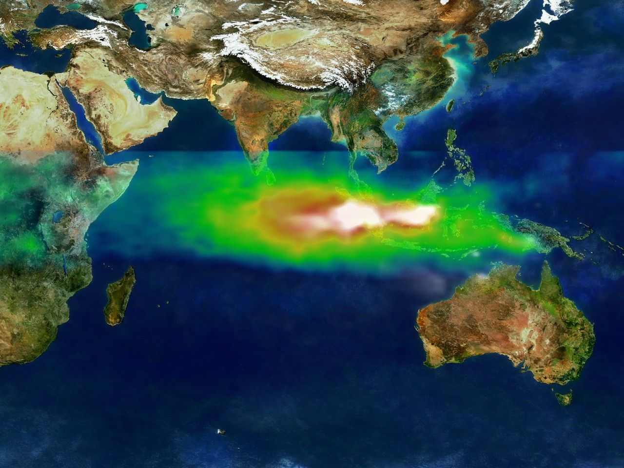 The above image shows the pollution over Indonesia and theIndian Ocean on October 22, 1997. White represents the aerosols (smoke)that remained in the vicinity of the fires. Green, yellow, and red pixels representincreasing amounts of tropospheric ozone (smog) being carried to thewest by high-altitude winds.