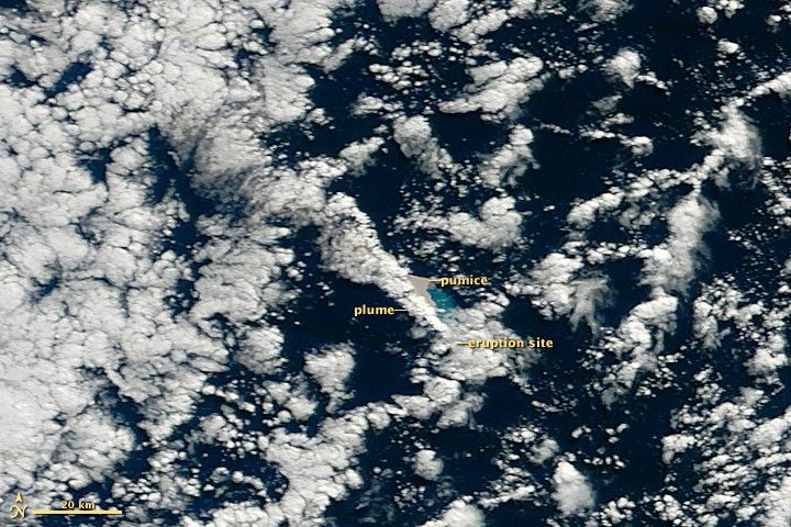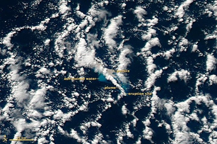 Though the pumice was spread over a vast area of the South Pacific, the origin was a mystery to the crew of the ship. An undersea volcano several hundred kilometers to the north of the pumice—Monowai—had erupted on August 3, but an airline pilot reported seeing pumice as early as August 1. Two data sources provided clues to pinpoint the volcano: earthquake records and satellite imagery. After reports of the pumice rafts surfaced, scientists from Tahiti and New Zealand’s GNS Science connected the eruption with a cluster of earthquakes in the Kermadec Islands on July 17 and 18.