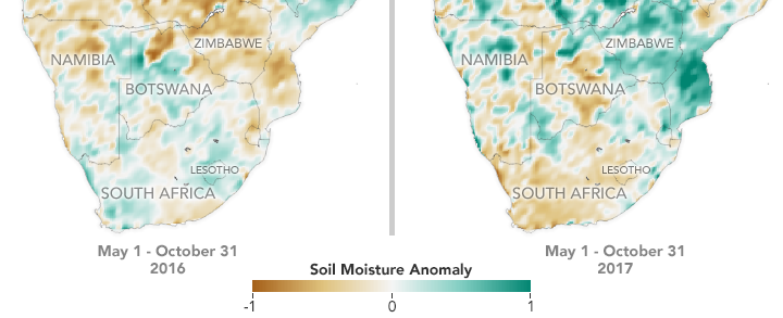 For three years, SMAP has helped map the amount of water contained in soils worldwide across months and seasons. Now those data are being applied on regional and local scales. The map above, based on SMAP data, shows soil moisture anomalies—how much the moisture content was above or below the norm—in the United States in mid-May 2018. The second map depicts anomalies and how they changed in southern Africa from 2016 to 2017.
