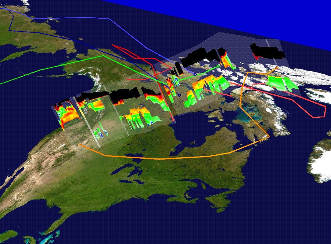Atmospheric scientists made seven flights to high latitudes fromBroomfield, Colorado, with bases in Churchill, Canada, and Thule,Greenland, during the Tropospheric Ozone Production about the SpringEquinox (TOPSE) field experiment. Remote lidar (laser radar)measurements taken by the NASA Langley Research Center’s LidarApplications Group found high springtime ozone levels in the loweratmosphere along the aircraft’s flight path. The image, recently createdto better visualize ozone data from TOPSE, is a representation of allozone data during April 2000. Blue areas show regions of the atmospherewith little ozone. Yellow to red areas indicate high ozone levels, andblack areas represent the stratosphere, where ozone is very high. Thecolored lines are calculated paths the air mass took going back 10 daysin time. Blue and green trajectories show air masses coming frompolluted regions of Asia and are associated with high ozone levels inthe lower atmosphere.