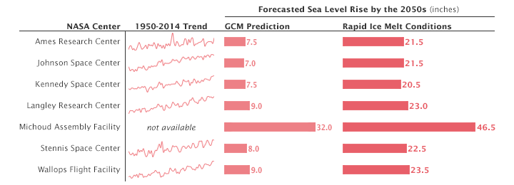 Sea level rise of between 13 and 69 centimeters by the 2050s is projected for NASA’s five coastal centers and facilities...Even under lower sea level rise scenarios, the coastal flood event that currently occurs on average once every 10 years is projected to occur approximately 50 percent more often by the 2050s in the Galveston/Johnson Space Center area; 2 to 3 times as often near Langley Research Center and Kennedy Space Center; and 10 times more frequently in the San Francisco Bay/Ames Research Center area. NASA coastal centers that are already at risk of flooding are virtually certain to become more vulnerable in the future.