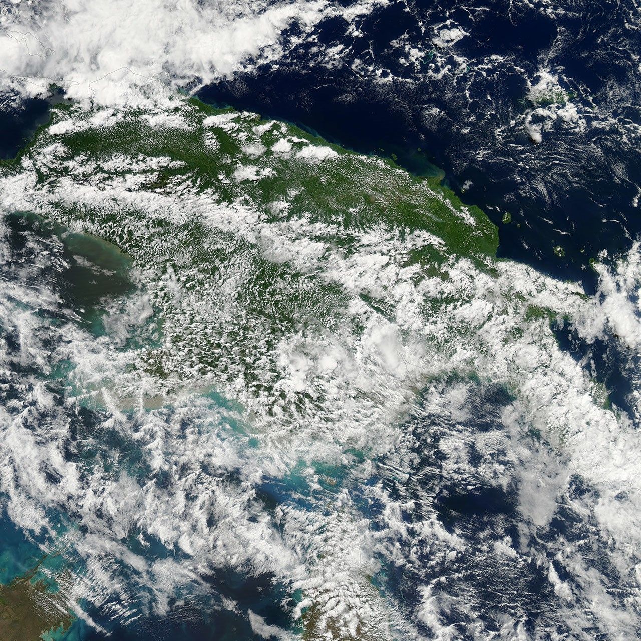 To put the spectra in context, this natural-color image shows the cloudy, forested scene below OCO-2 just minutes after it collected its data. The color image was acquired by the Moderate Resolution Imaging Spectroradiometer (MODIS) on NASA’s Aqua satellite, which flies in the same A Train orbit.