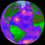 Armed with data from NASA’s Quick Scatterometer (Quikscat), weather forecasters can now predict hazardous weather events over the oceans as much as 6 to 12 hours earlier. (Click to read the full press release.) The direction and intensity of surface winds across the Atlantic Ocean are shown in the Quickscat image above. Orange areas show where winds are blowing the hardest, while violet is an intermediate value, and blue shows relatively light winds.