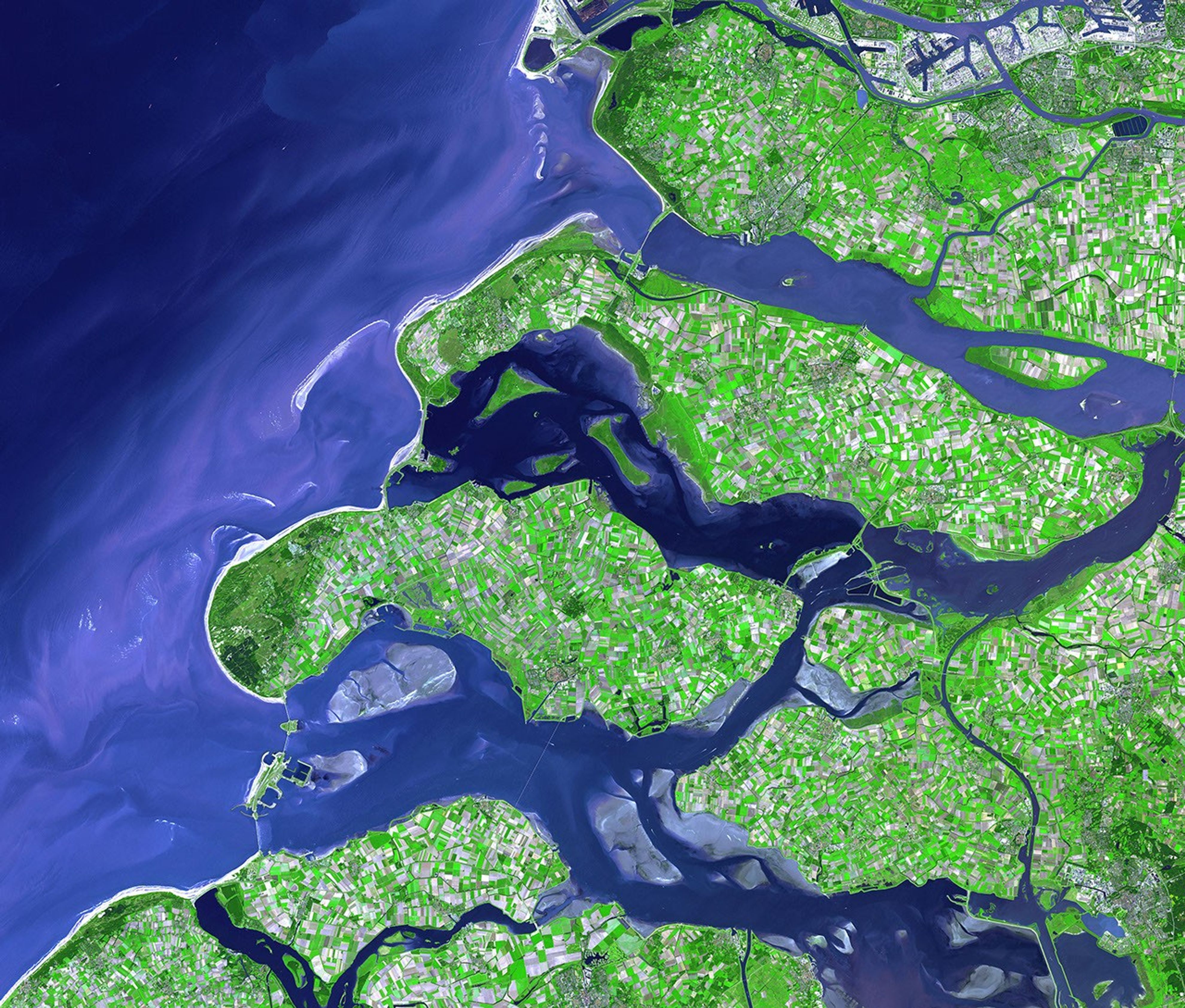 The patchwork of green, cream, and lavender colors on the islands shows the prevalence of agriculture in the province and fields in various stages of growth or harvest. The islands are cut through by the blue ribbons of canal, such as the Scheldt-Rhine Canal that flows into the image at lower right, cuts through Tholen Island and ends in the Krammer Strait. In the Eastern Scheldt Estuary, several light purple sandbars sit below the surface of the water. The high-resolution image shows ships in some of the canals and in the North Sea.