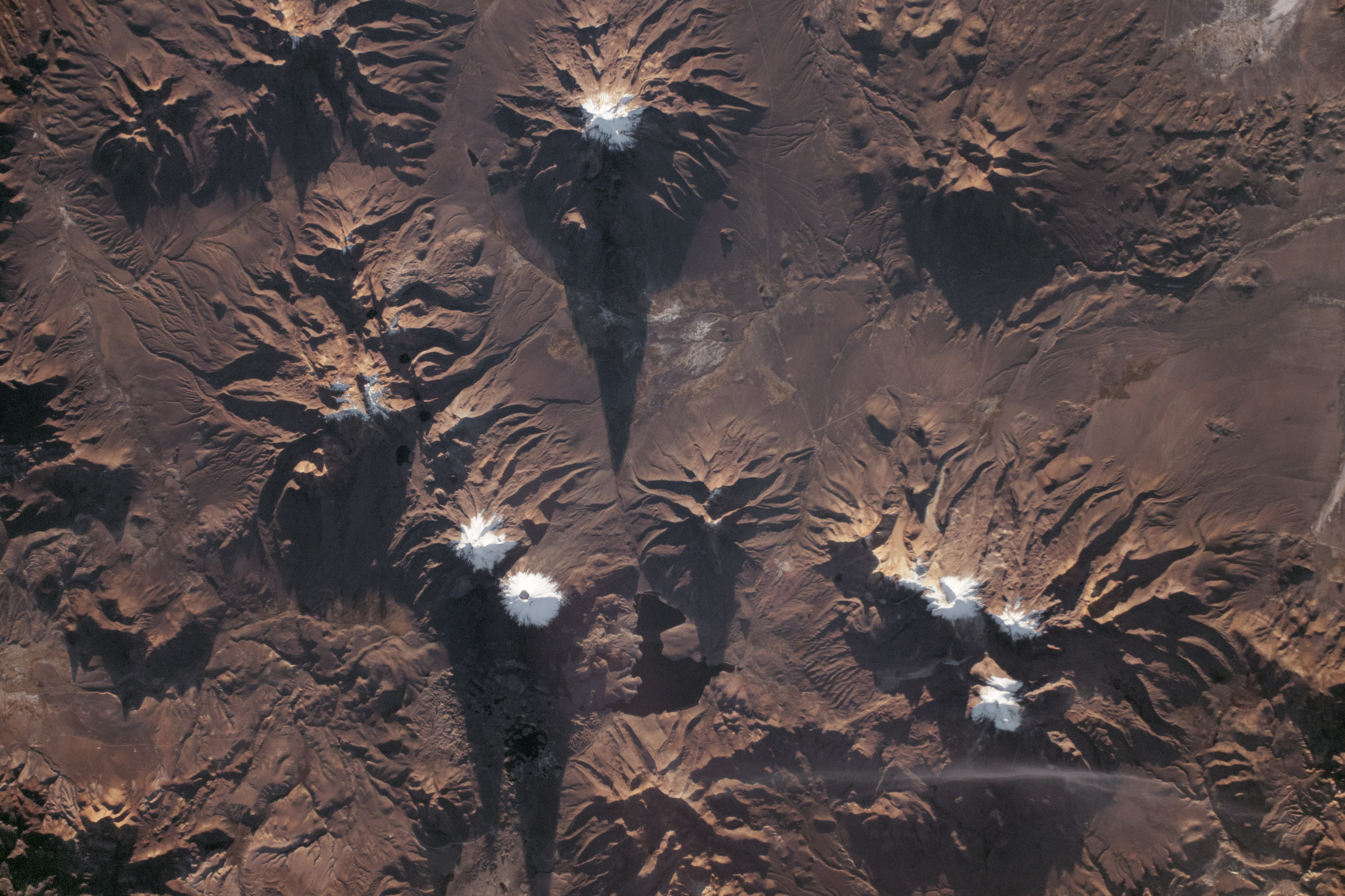 Shot by an astronaut onboard the International Space Station (ISS), this photograph highlights several snow- and ice-capped volcanoes as they cast early morning shadows over a mountainous region of Bolivia and Chile. Such long shadows often accentuate the three-dimensional sense of the landscape.