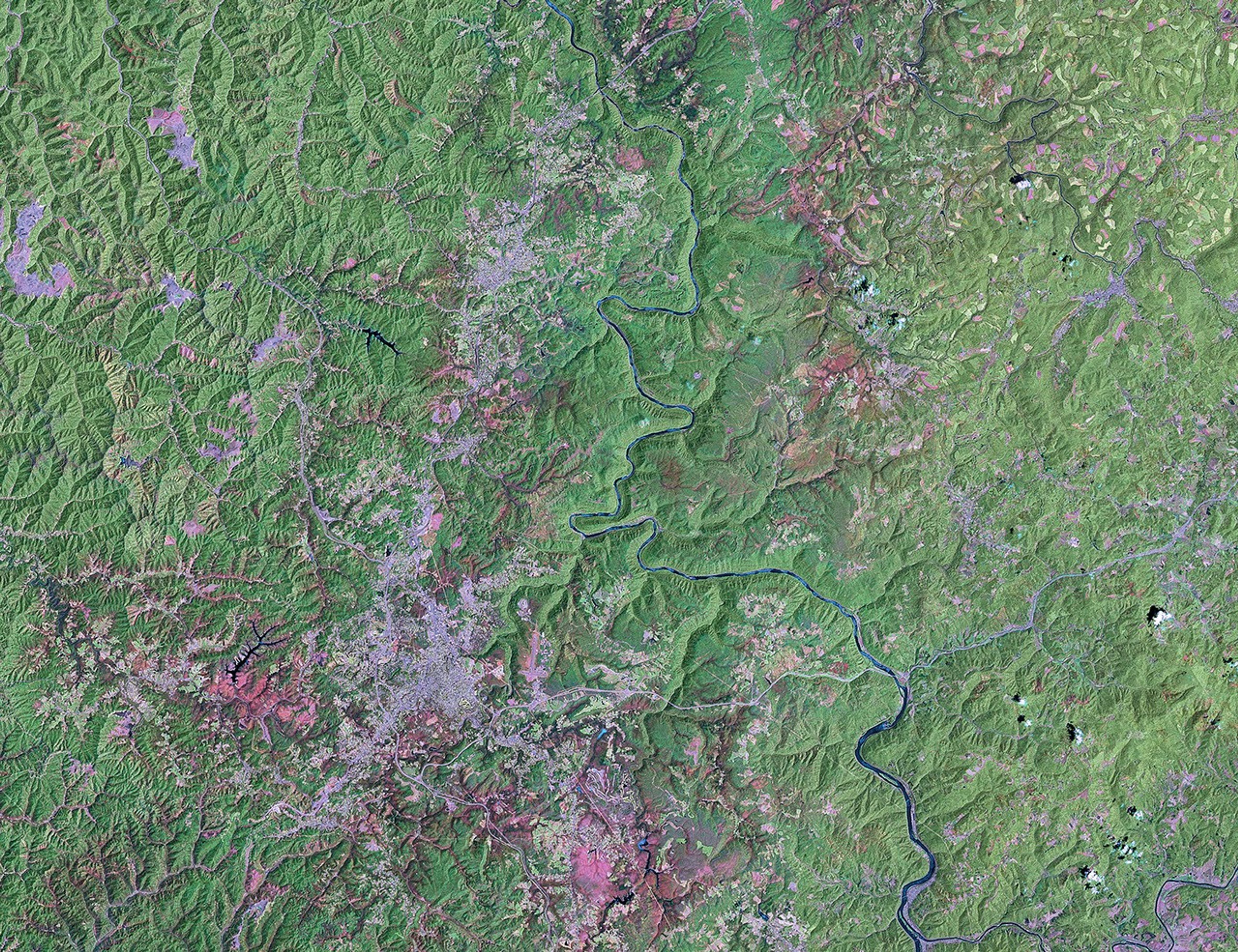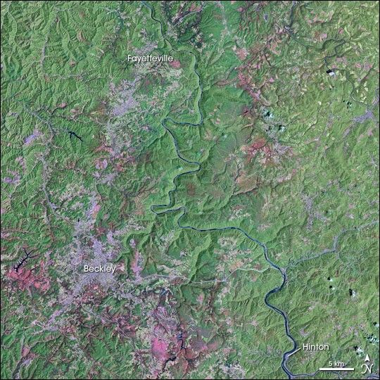 Other prominent features in this image are the light purple patches of towns and cities, and the corridor of homes and communities along major highways between these towns. Hinton sits right on the river, but to the north, it is more than the National Park designation that prevented similar settlements: here the Gorge is so steep that the small coal mining towns that used to cling to the sides of the mountains never grew into cities, and they were abandoned when the coal boom died. Today, larger towns and cities are located on top of the plateau. Brilliant pinks outside Beckley are deforested areas around major coal mining operations, including controversial mountaintop removal sites.