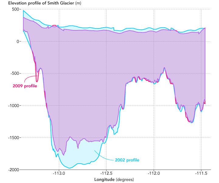 The chart below shows the height above water and depth below water of Smith Glacier at different longitudes in 2002 (blue) and 2009 (red and purple). Purple is where the two profiles overlap. Note the minor changes in the surface of the glacier and the great changes on the underside.