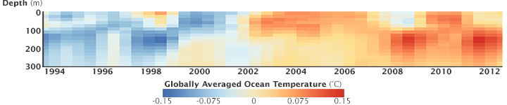 The figure below depicts the trends in a different way. It represents a cross-section of the top 300 meters of the global ocean and how temperatures changed from 1993 to 2012. Note how there are cooler waters near the surface in several years in the 2000s, but that waters at depth grow much warmer. Note, too, how the overall trend in 20 years goes from a cooling ocean to a significantly warmer ocean.