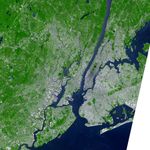 This false-color satellite image shows greater New York City. The Island of Manhattan is jutting southward from top center, bordered by the Hudson River to the west and the East River to the east. (North is straight up in this scene.) In the middle of Manhattan, Central Park appears as a long green rectangle running roughly north-south with a large lake in the middle. Also visible are parts of Staten Island (bottom left corner) and Long Island (lower right).