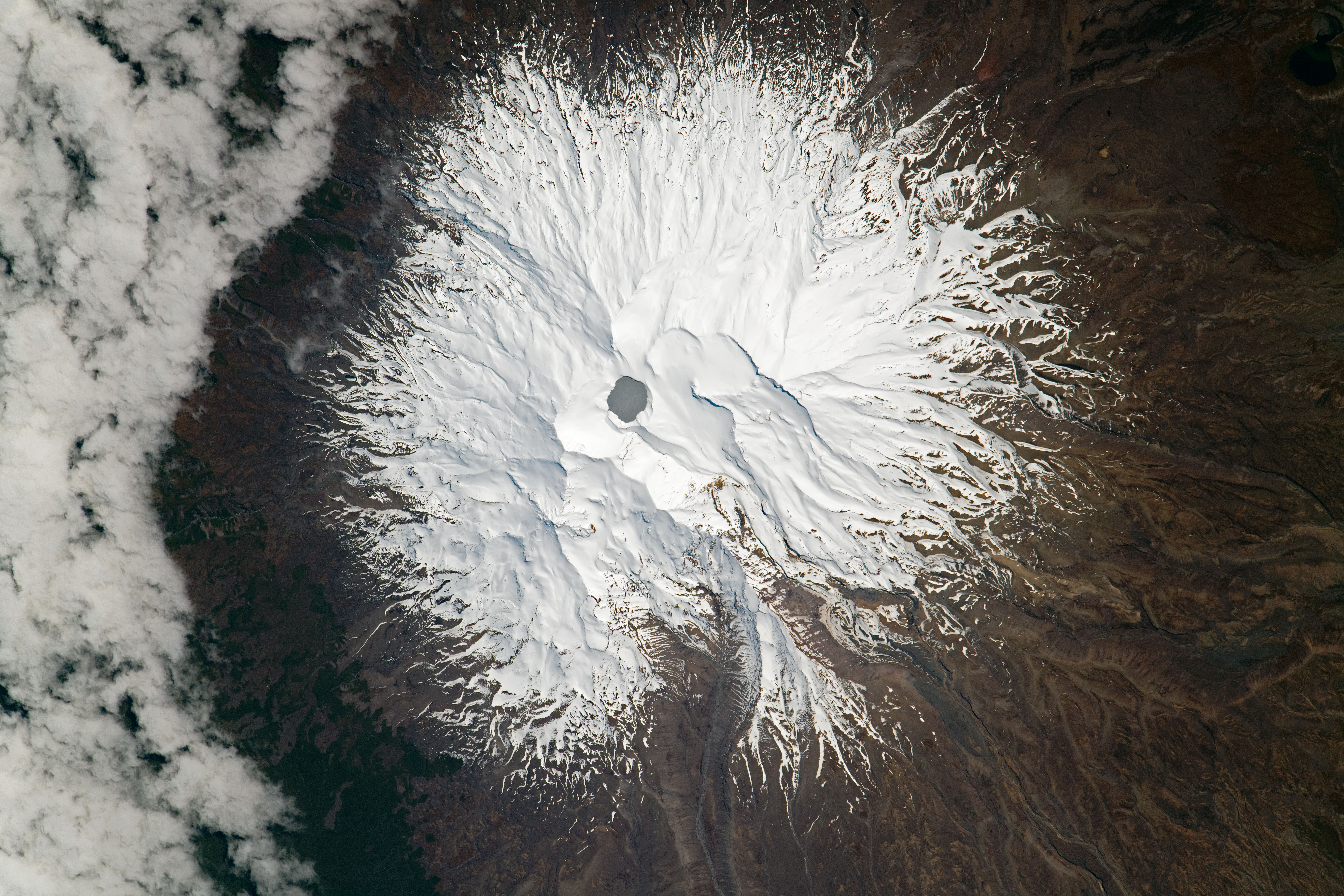 While passing over the North Island of New Zealand, an astronaut onboard the International Space Station (ISS) took a photograph of Mount Ruapehu, offering a nadir (straight down) view of the mountain and Tongariro National Park. Ruapehu is an active stratovolcano that stands 2,797 meters (9,177 feet) at its highest point. It is the tallest mountain on North Island.
