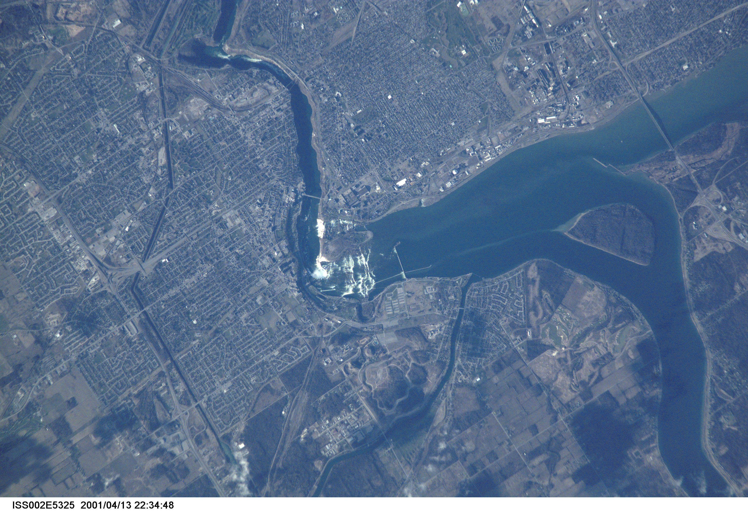 Viewing the tumbling waters of the Niagara River from the microgravity environment of the International Space Station, astronauts recently acquired this image. They were at an orbit of 207 nautical miles (383 km) above the Falls, and used a digital camera with an 800 mm lens. In taking these kinds of detailed images, Space Station crewmembers have compensated for the relative motion of the Earth, thus achieving spatial resolutions of less than 6 m and surpassing the previous records for spatial resolution from human spaceflight. Details of the city of Niagara Falls are easy to see; for spatial reference, the American falls is 328 m wide (1075 ft), and the Horseshoe Falls is 675 m wide (2200 ft).