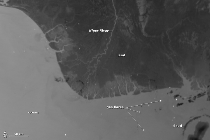 The flares and oil production occur both on land and offshore. In fact, it is hard to see where the land ends and the ocean begins in the night lights image above, which shows the delta region in visible light as it might appear to the human eye. But viewing the scene in infrared light, as shown below, better reveals the distribution of the flares.