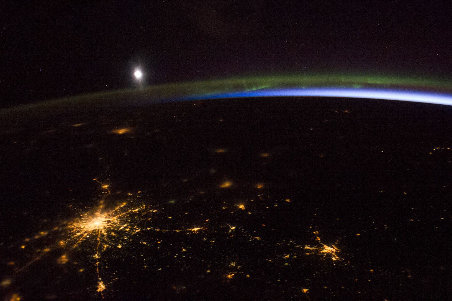 A thin green line of the aurora borealis (northern lights) crosses the top of this photograph, taken by an astronaut on the International Space Station. The moon appears as a white disc just above the aurora. Airglow appears as a blue-white cusp along the Earth’s limb. Russia’s capital city, Moscow, makes a splash of yellow light and is easily recognized by the radial pattern of its highways. Other cities are Nizhni Novgorod (400 kilometers from Moscow), Saint Petersburg (625 kilometers away), and Finland’s capital city Helsinki.
