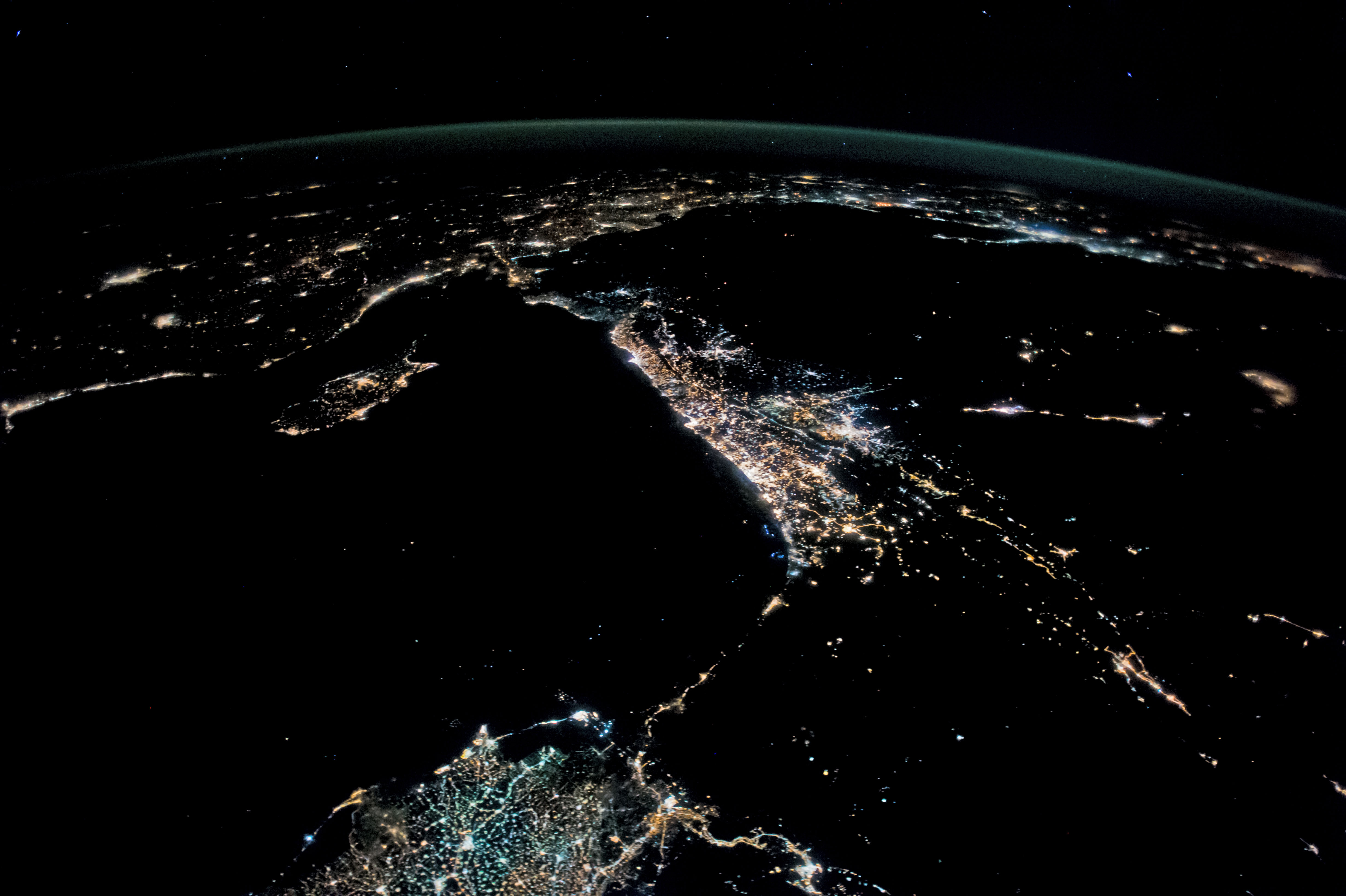 Other light clusters include the Nile Delta in Egypt, and a nearby thin string of lights revealing the Suez Canal. The more scattered lights of the Turkish coastline and the country’s mountainous interior arc from top left to top center.