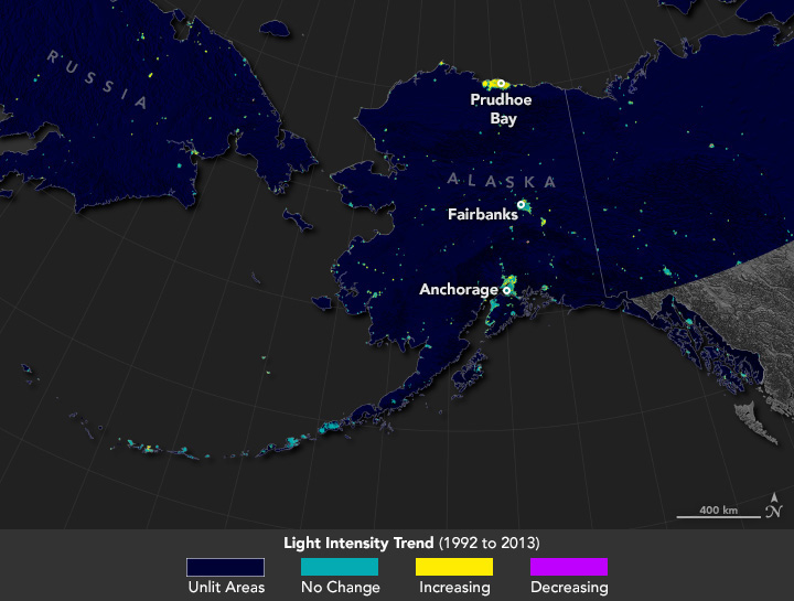 The map above shows a pan-Arctic view of nighttime lights and places where the intensity of artificial lights has increased (yellow), decreased (purple), or stayed the same (green). The team used nighttime satellite observations from the U.S. Defense Meteorological Satellite Program (DMSP).
