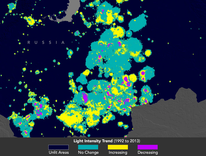 The detailed map above shows Russia’s Khanty-Mansi region, a vast, swampy area in the western Siberian Plain. The region is home to the Samotlor, one of the largest oil fields in the world, which saw the greatest expansion of nighttime lights during the study period.