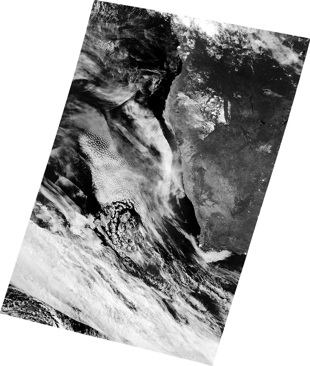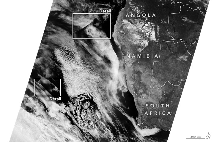 The complex wave clouds near Angola suggest that there could be a variety of sources. Note the particularly abrupt edge between clouds and clear sky to the lower right. According to Yuter, that feature is likely due to “cloud erosion.” Marine layer clouds are thin and sit low in the sky—just a few hundred meters thick and topping out at about 2 kilometers in altitude. If gravity waves can mix enough dry air from above the cloud layer into this thin cloud layer, the relative humidity drops and the cloud layer dissipates.