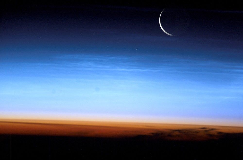 The sliver of the setting moon and clouds that shine at night—noctilucent clouds—caught the eye of astronaut Ed Lu aboard the International Space Station (ISS) last week.