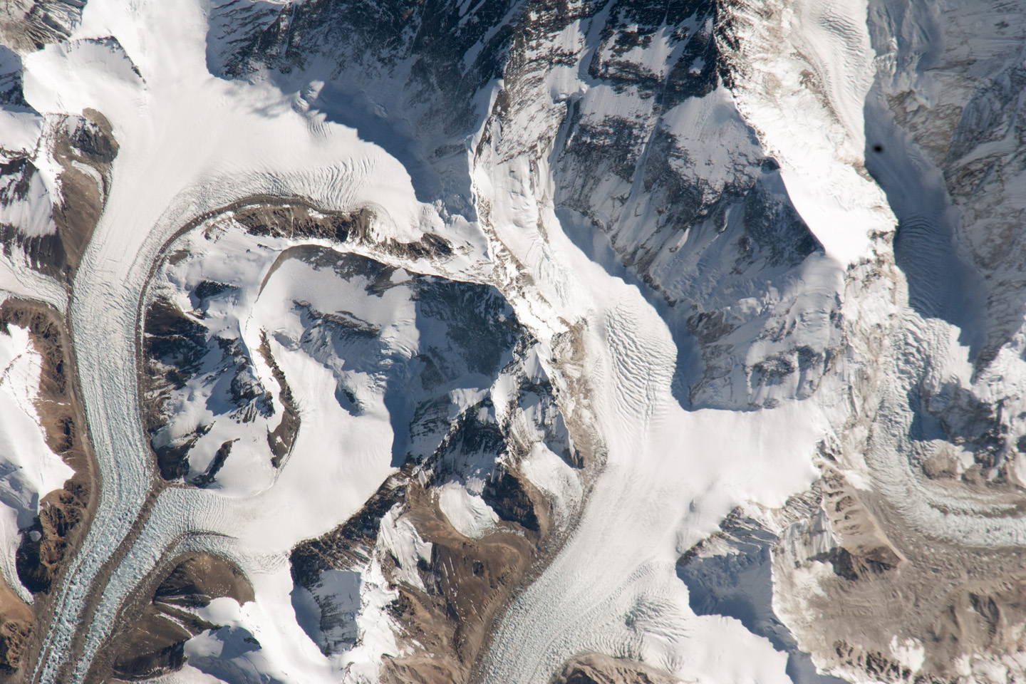 Located within the Himalaya mountain chain, Everest (or Sagarmatha in Nepali) is the Earth’s highest mountain, with its summit at 8,848 meters (29,029 feet) above sea level. Khumbutse mountain, visible at the lower right, has a summit elevation of 6,640 meters (21,785 feet) asl. While the near-nadir viewing angle—almost looking straight down from the International Space Station—tends to flatten the topography, astronauts have also taken images that highlight the rugged nature of the area.