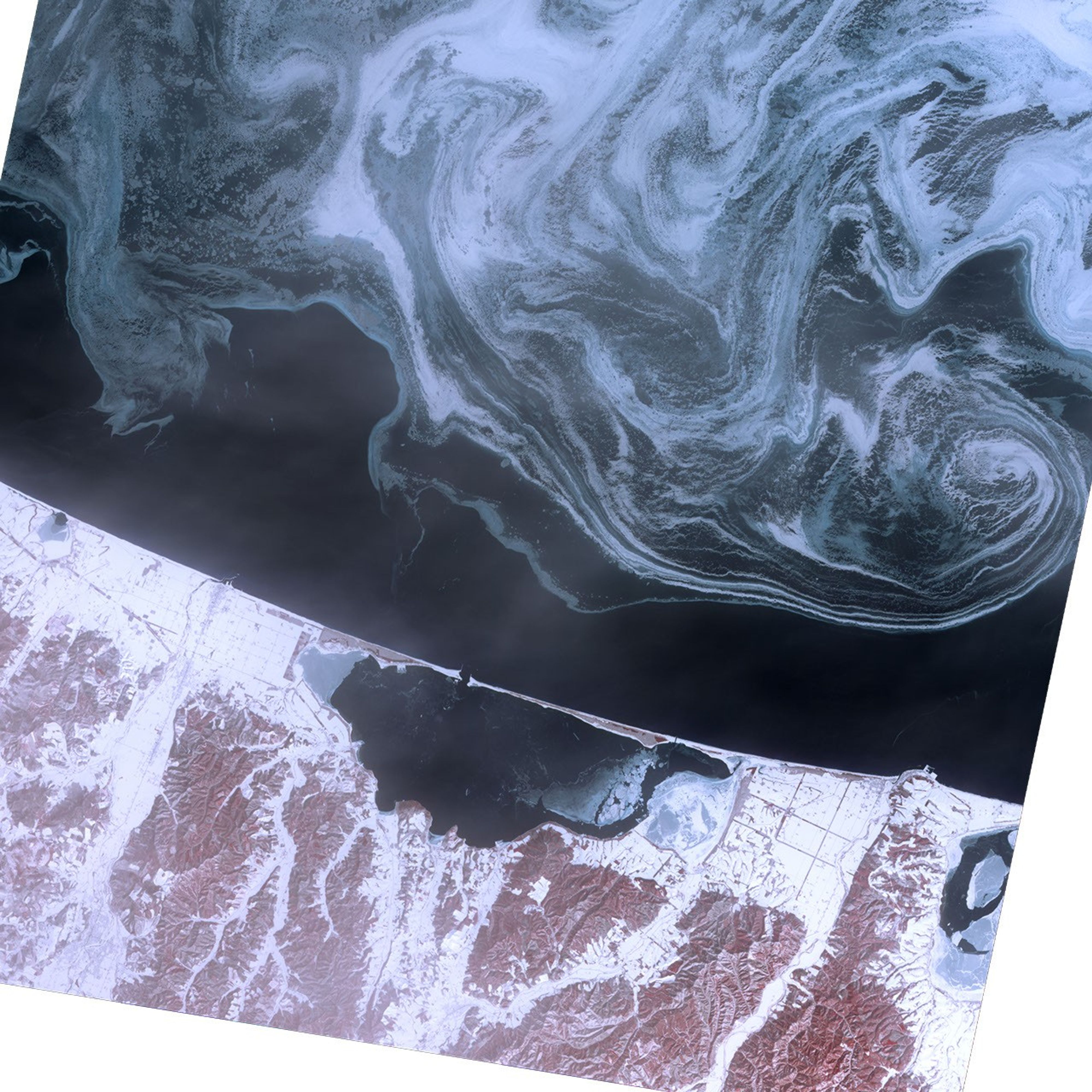 Sea ice formed delicate swirls of blue and white in the Sea of Okhotsk in February 2009. This image acquired by the Advanced Spaceborne Thermal Emission and Reflection Radiometer (ASTER) on NASA’s Terra satellite shows the northern coast of Japan’s Hokkaido Island on February 11, 2009. In this false-color image, water is dark blue, sea ice and snow are pale blue or white, and vegetation is red.