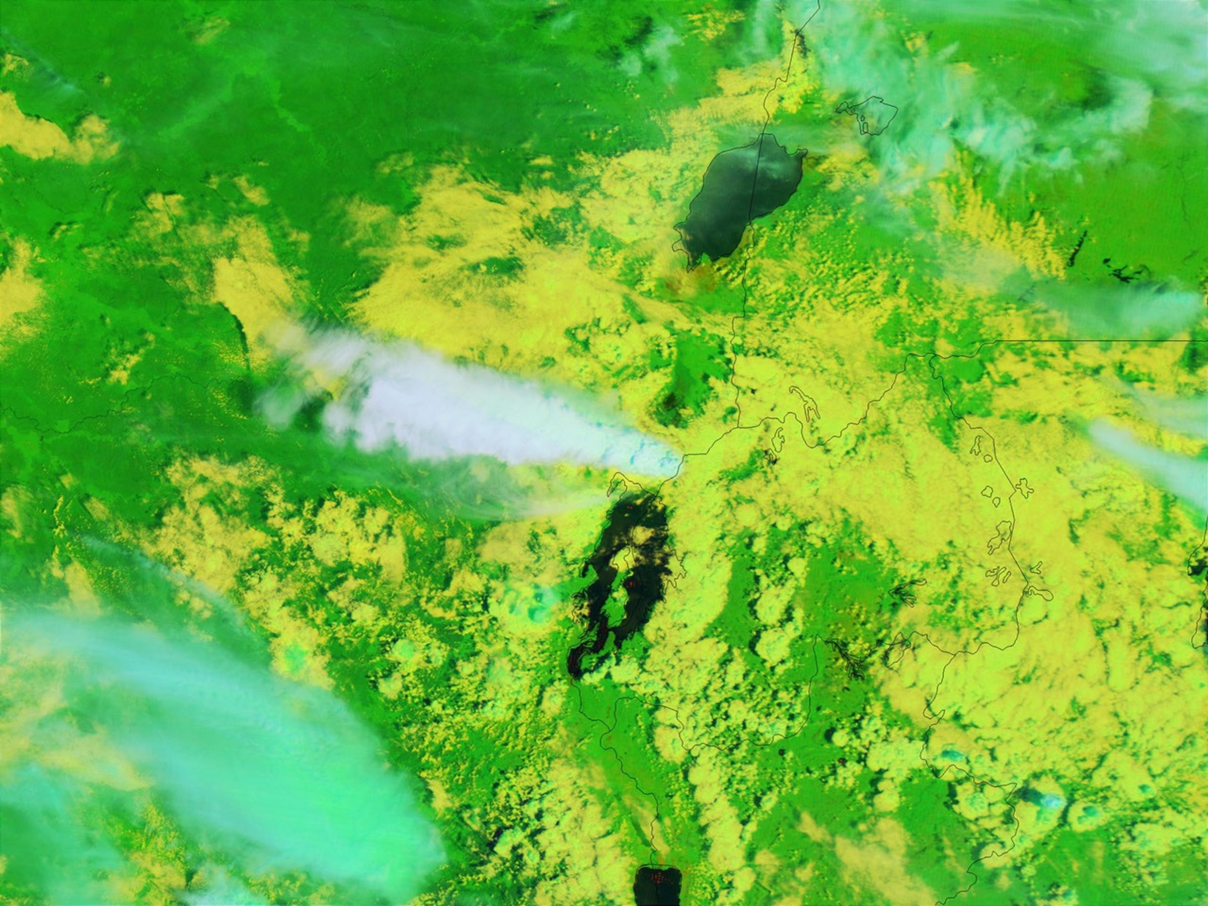 This false-color image was acquired today (January 17) by the Moderate-resolution Imaging Spectroradiometer (MODIS) roughly 5 hoursafter the eruption began. Notice Mount Nyiragongo’s large plume(bright white) can be seen streaming westward in this scene. The plume appears to be higher than the immediately adjacent clouds and so it is colder in temperature, making it easy for MODIS to distinguish the volcanic plume from the clouds by using image bands sensitive to thermal radiation.