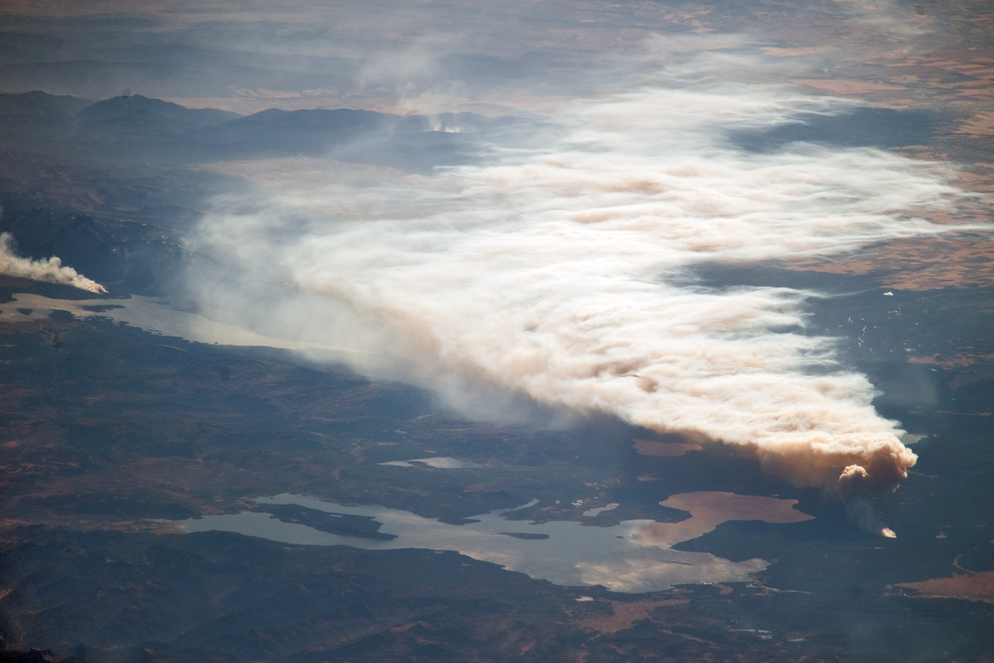 The image is highly oblique, or taken looking outwards at an angle, rather than straight down towards the Earth’s surface. The ISS was approximately above Lake Winnipeg, Manitoba, Canada—almost 1,200 kilometers (746 miles) to the northeast of the fire—when this image was taken using a long lens. Landmarks visible in the image include Yellowstone and Jackson Lakes at image center; the Teton Range is visible in the background. The reflection of the smoke plume is visible in Yellowstone Lake.
