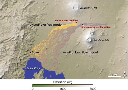 The December 4 data led scientists to revise their prediction of where the lava would flow. Based on the best estimate of the vent location from staff at the Goma Observatory, models run by geologist Paolo Papale and his colleagues at the L’Istituto Nazionale di Geofisica e Volcanologia (INGV) in Italy initially predicted that lava would flow both to the east and to the southwest, toward the town of Sake. The estimate for the vent location, however, was off by about 2 kilometers.