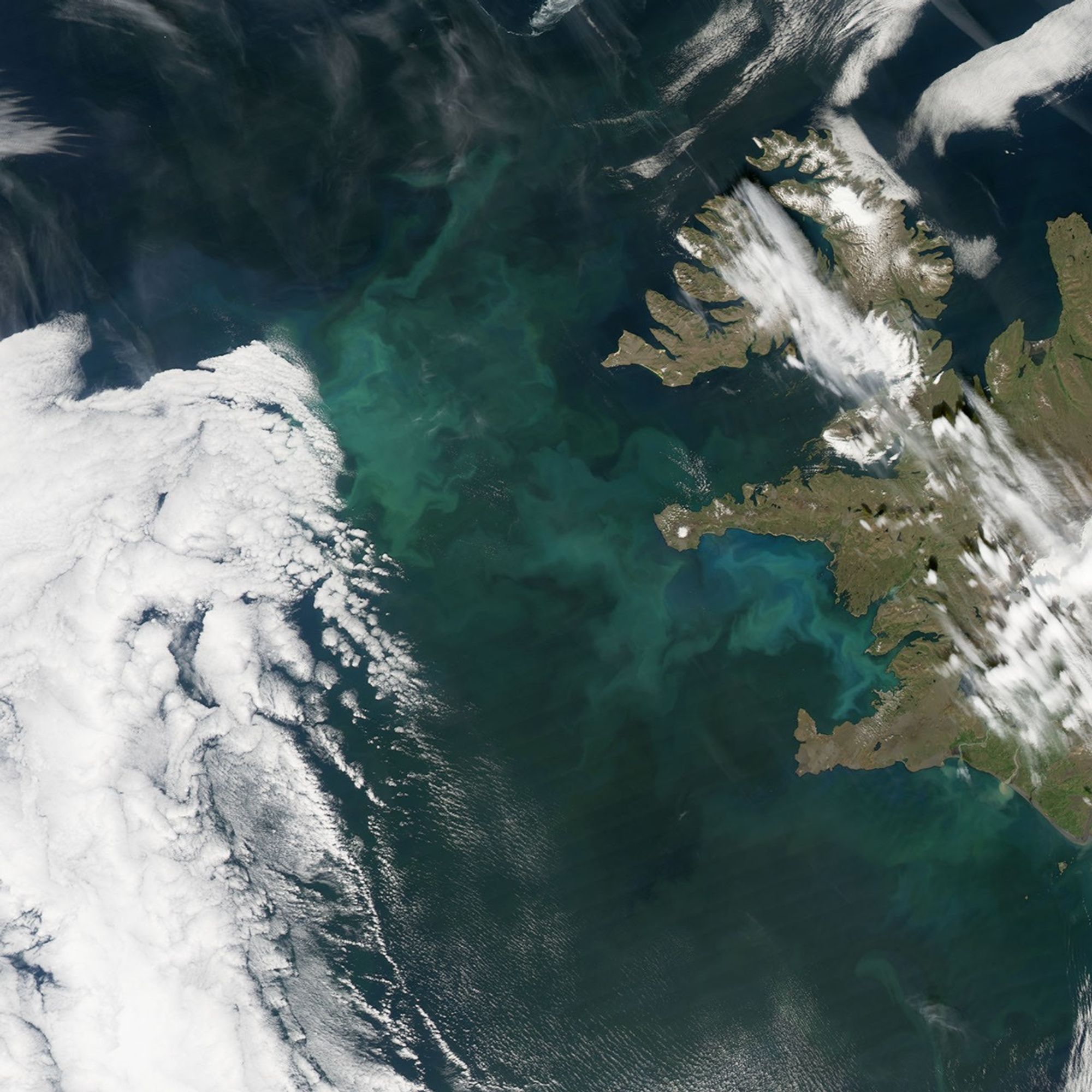 One of the larger regularly observed blooms occurs in the North Atlantic Ocean near Iceland and Greenland in Northern Hemisphere summer. The Moderate Resolution Imaging Spectroradiometer (MODIS) flying on NASA’s Aqua satellite captured this image of a bloom on July 10, 2008. The phytoplankton color the water with swirls in shades ranging from deep green to bright turquoise.