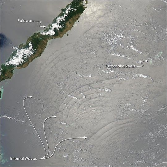 This image shows the surface of the Gulf of Mexico, northeast of the Yucatan Peninsula. Acquired by an imaging radar, the scene shows several features that would be difficult to observe with visible light. In the center of the image are a series of widely-spaced internal waves. The subsurface internal waves are detectable by radar imagers because they modify the patterns of shorter wavelength waves on the sea surface. The brightness of the radar image depends on the roughness of the surface (smooth surfaces reflect radar waves away from the sensor, while rough surfaces reflect them back towards the sensor).