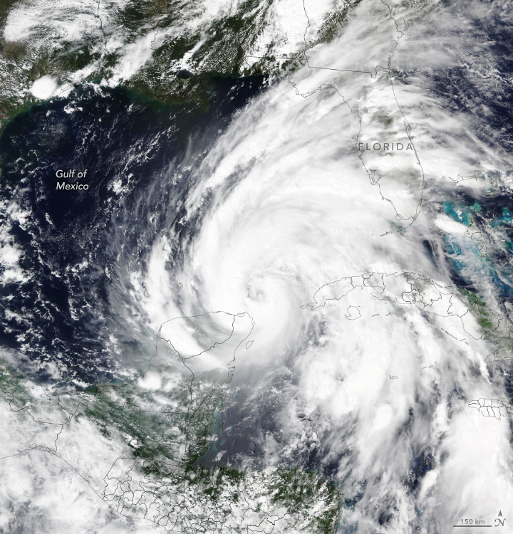 Sea surface temperature and ocean heat content data—both derived from satellite observations—showed a tongue of unusually warm water extending north from the Caribbean Sea into the Gulf of Mexico toward the Florida Panhandle. It was a sign that the Loop Current—a variable current that shunts water from the Caribbean Sea into the Gulf of Mexico, around Florida, and up the eastern coast of the U.S.—had shed an eddy of warm water that was lingering uncomfortably close to U.S. shores.