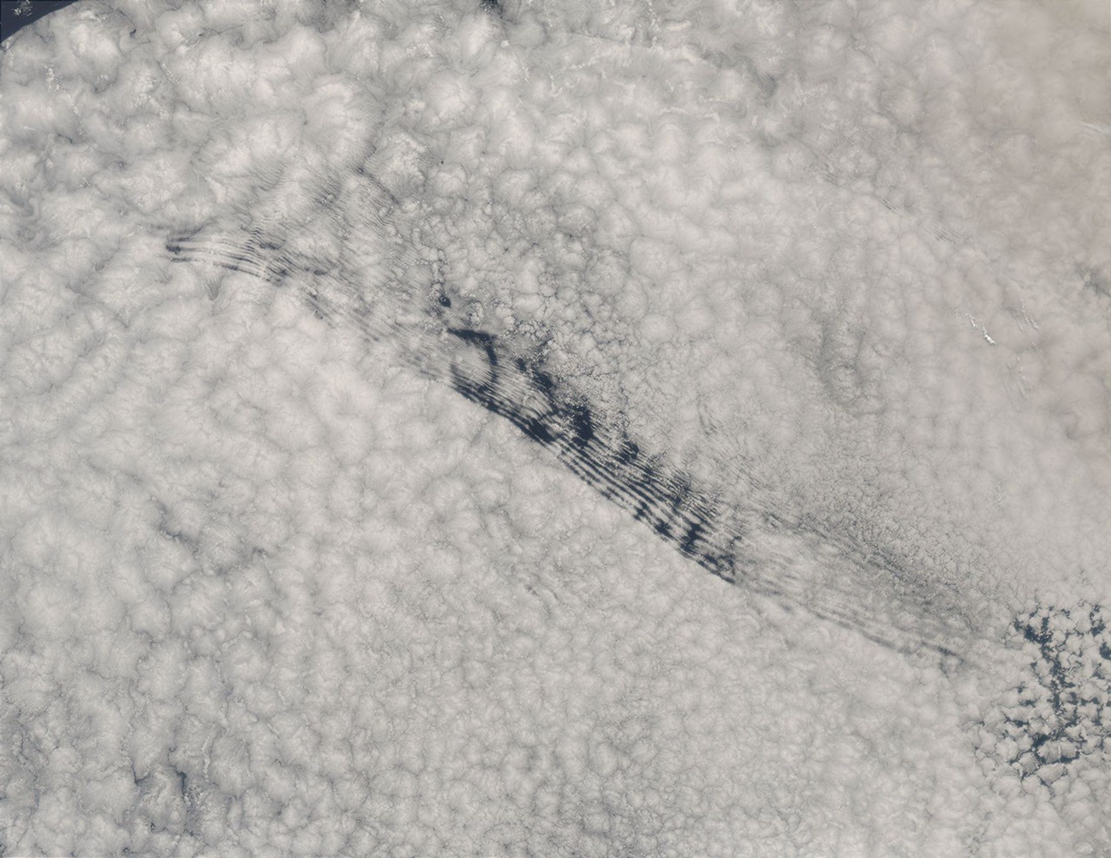 Notice the grooved pattern running from upper left (northwest) to lower right (southeast) through the marine stratus clouds in this scene. It is unusual to see such sharp boundaries in clouds, particularly when they extend in such a regular pattern for such a long distance. So far, consensus is the patterns cannot be due to gravity waves, as the scene is not over land, nor are they due to an air mass advecting horizontally through the cloud deck. So the question remains: What made this pattern?