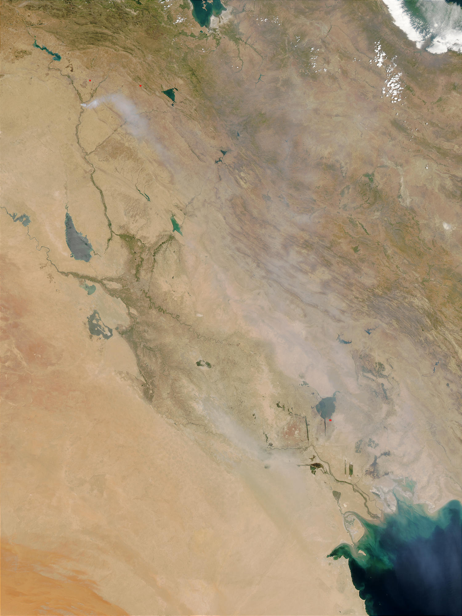 A fire burning at an industrial sulfur processing facility innorthern Iraq at the junction of the Tigris (flowing in from North) andGreat Zab (northeast) Rivers billowed white smoke over Iraq and otherMiddle Eastern countries beginning on June 25, 2003. The fire continued toburn for two weeks, spreading the sulfur-containing smoke over awide area. According to local media reports, the smoke was responsible forcrop damage and other environmental problems as well as respiratorydistress among people in the area. Thisimage of the white smoke hanging over the region was captured by the Moderate ResolutionImaging Spectroradiometer (MODIS) on the Aqua satellite on June 29, 2003