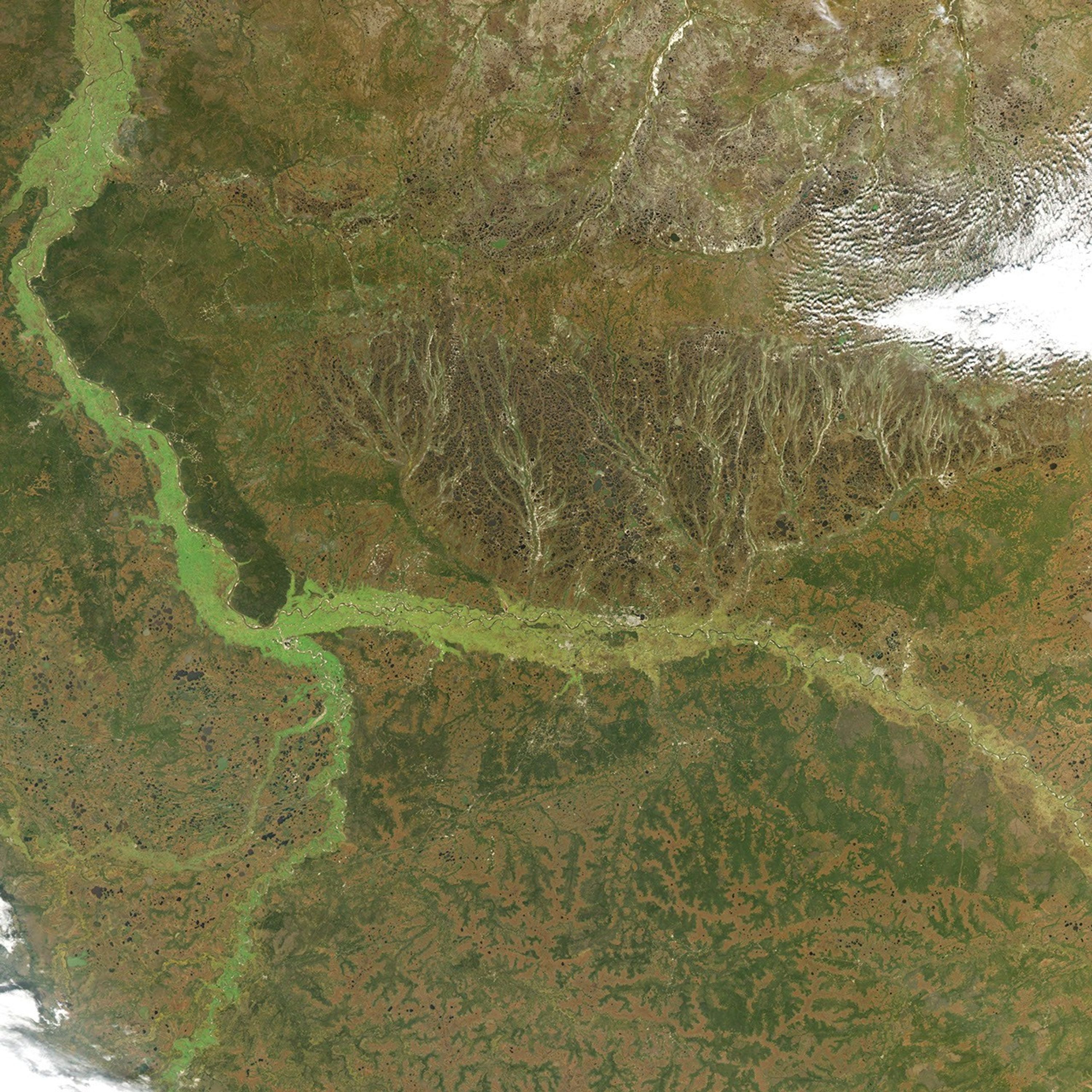 While most of the gas fields are clustered north of the Arctic Circle along the Yamal and Gydan Peninsulas, this image features oil fields near the confluence of the Irtysh and Ob rivers. The oil-drilling operations appear as a network of scattered gray dots against the green and brown landscape. In the floodplains and stream valleys, forests (green) dominate, whereas fall weather has turned vegetation in the bogs, fens, and mires (north and south of the river) brown. Large numbers of lakes (dark blue) are scattered throughout the image. The tendrils of green running through the swampy areas are forests. The Moderate Resolution Imaging Spectroradiometer (MODIS) on NASA’s Aqua satellite acquired the image on September 30, 2016.