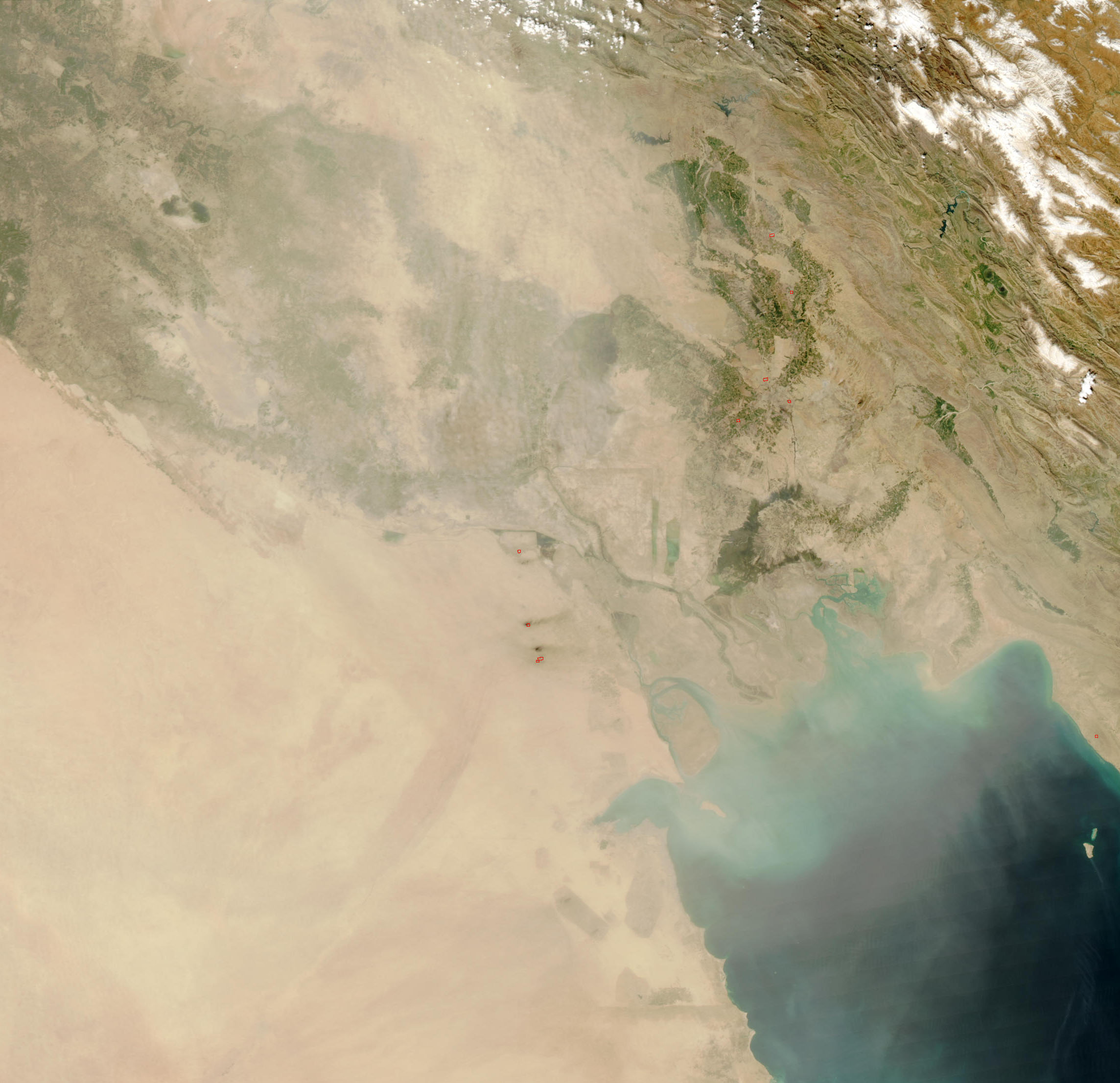 This image of Iraq, Kuwait, and parts of Saudi Arabia and Iran was acquired by the Moderate Resolution Imaging Spectroradiometer (MODIS) on the Aqua satellite on March 20, 2003, at 09:50 UTC (or 12:50 p.m. local time in Baghdad.) The image shows dust over the Middle East and the Persian Gulf, as well as several thermal anomalies detected by MODIS that have been marked with red dots or outlines. Plumes of black smoke are associated with these hot spots in southern Iraq and locations are consistent with known oil wells. Thermal signatures in Iran are likely fires.