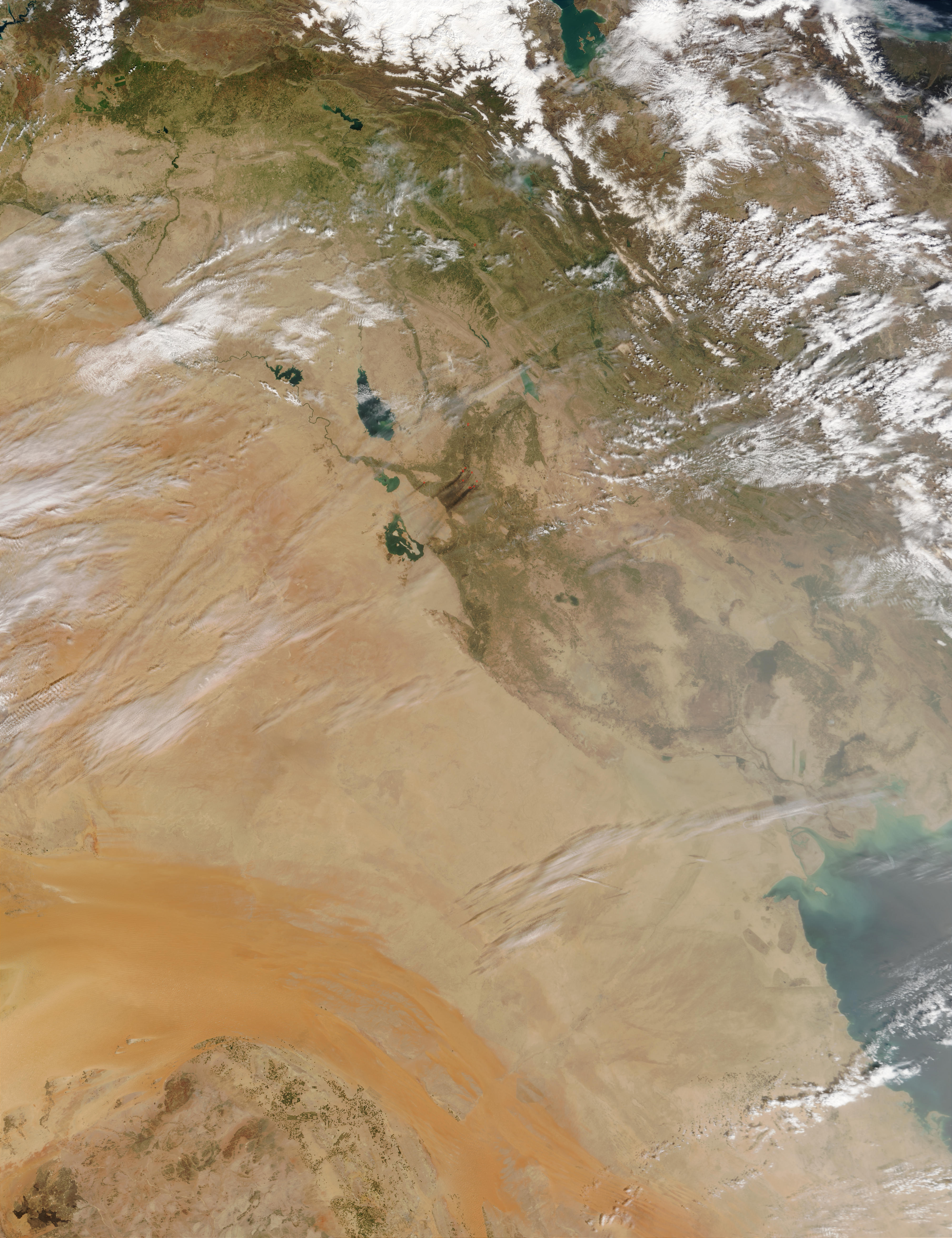 On Monday, March 31, 2003, the Moderate Resolution Imaging Spectroradiometer (MODIS) on the Terra satellite captured this image of the Middle East. In the center of the image, several thermal detections were made by MODIS in and around Baghdad and are marked with red dots. The dark plumes of smoke associated with the hot spots suggest they are oil fires. Meanwhile, to the south, dust once again is blowing over southern Iraq, Iran, Kuwait, Saudi Arabia, and the Persian Gulf.